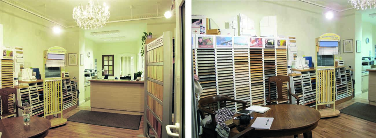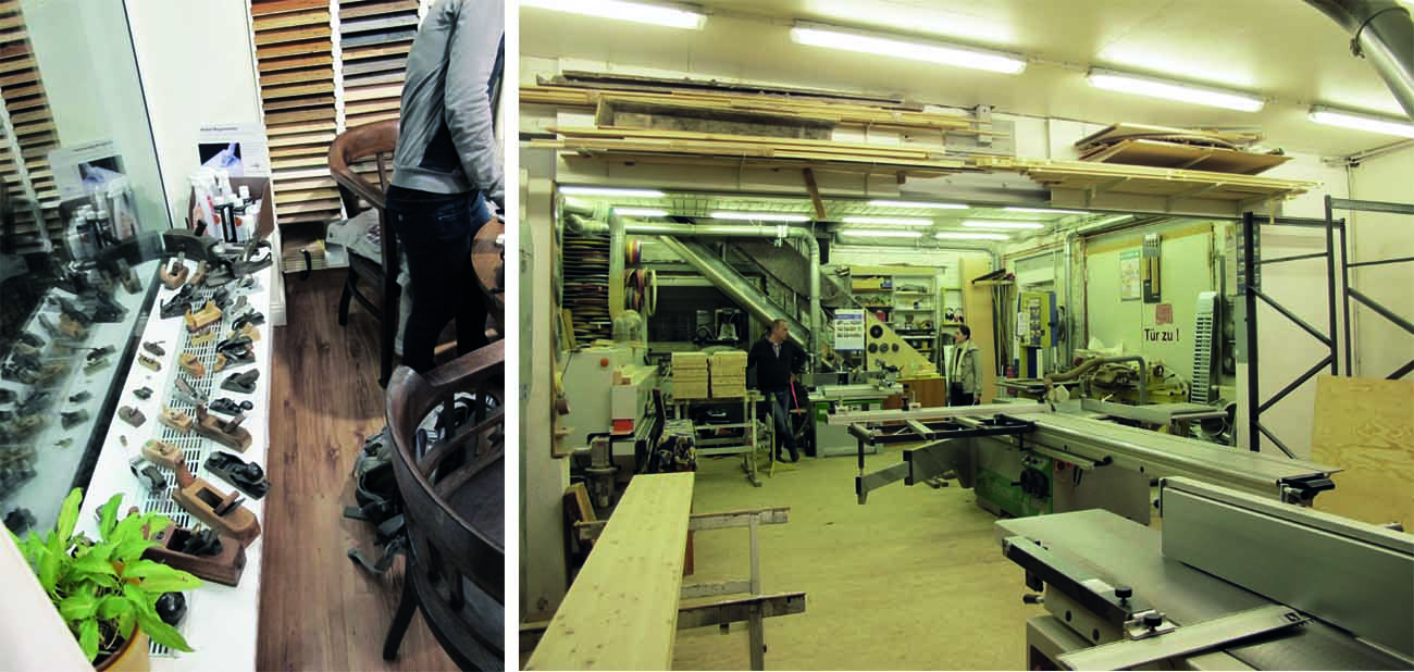 Die Räumlichkeiten des Tischlerbetriebs umfassen einen Laden direkt an der Siegfriedstraße und eine Werkstatt im Hof dahinter. Im Schaufenster des Ladens fällt sofort die Ausstellung von kleinen Hobeln auf. Diese Sammlung war eine Idee von Kai Dumong und wird von Kunden und Nachbarn laufend ergänzt. Im Laden gibt es einen Kundenbereich, wo in Früh- und Spätschichten Mitarbeiterinnen die Kunden betreuen. Hier werden verschiedene Holzmuster ausgestellt, ab und zu auch mal ein Möbelstück. Hinter dem Kundenraum befinden sich die Büros, die zum Innenhof orientiert sind. Die Werkstatt im Innenhof wird durch die Toreinfahrt von der Siegfriedstraße erschlossen.