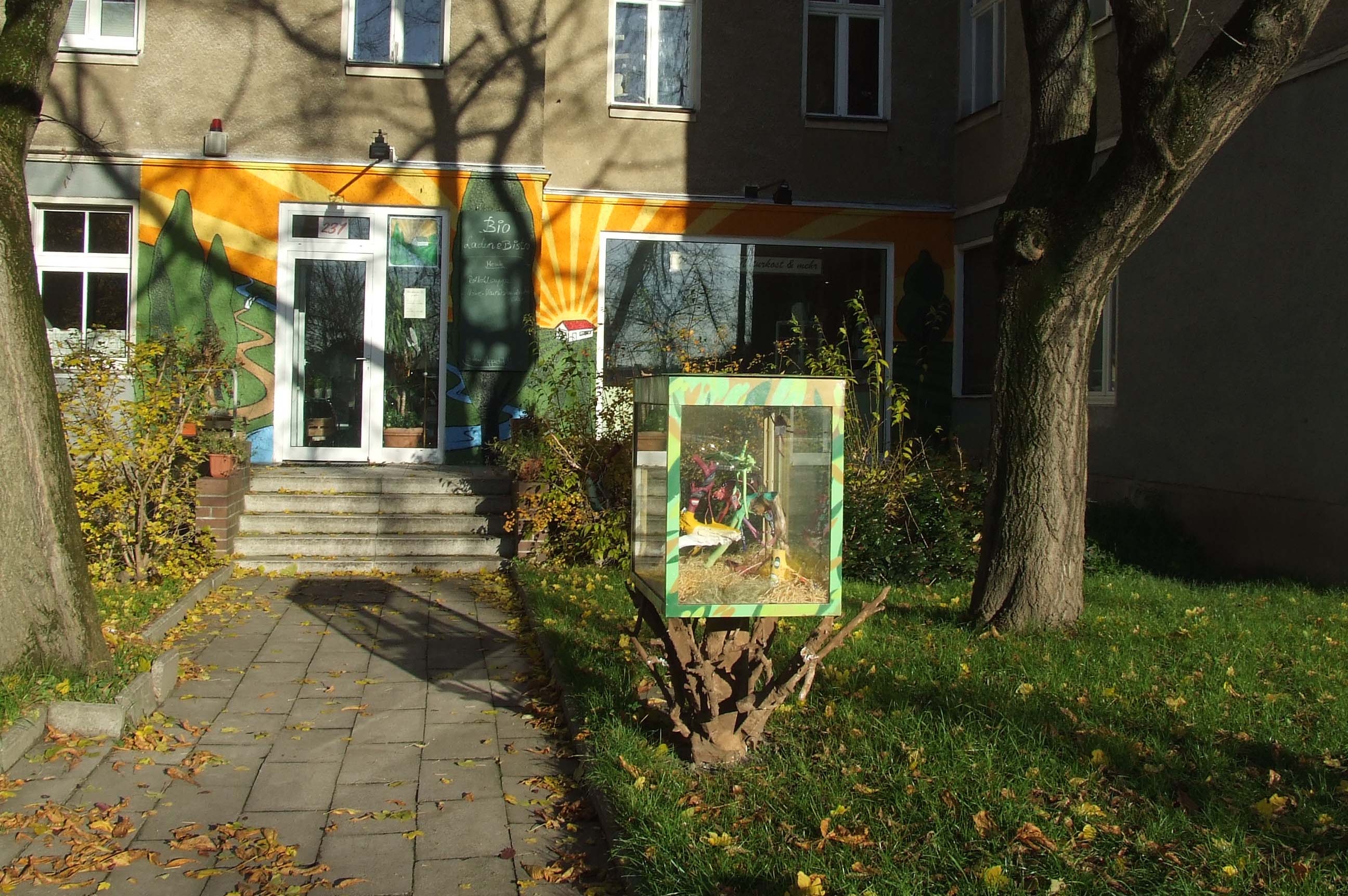 Schon von der gegenüberliegenden Seite der Frankfurter Allee sticht der Bioladen wie ein bunter Fleck auf einer grauen Fassade hervor. Der Kratzputz ist farbenfroh mit Bäumen und einer Sonne angemalt, vor dem Eingang laden ein Vorgarten mit einer Hollywoodschaukel und zwei kleine Schaukästen zum Besuch ein.