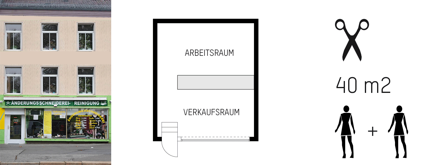 Die Schneiderei bietet allerlei Änderungen und Reparaturen an. 2013 hat Frau X. das Geschäft mit großen Hoffnungen übernommen. Diese basierten auf der guten Lage am Eingang des Quartiers und dem Anschluss an die verschiedenen Bahnlinien. Die Besitzerin hat viele Bekannte im Ostteil der Stadt, da die vietnamesische Gemeinschaft dort stark vertreten ist. Dies gilt insbesondere für Marzahn, wo sie auch selbst wohnt.
