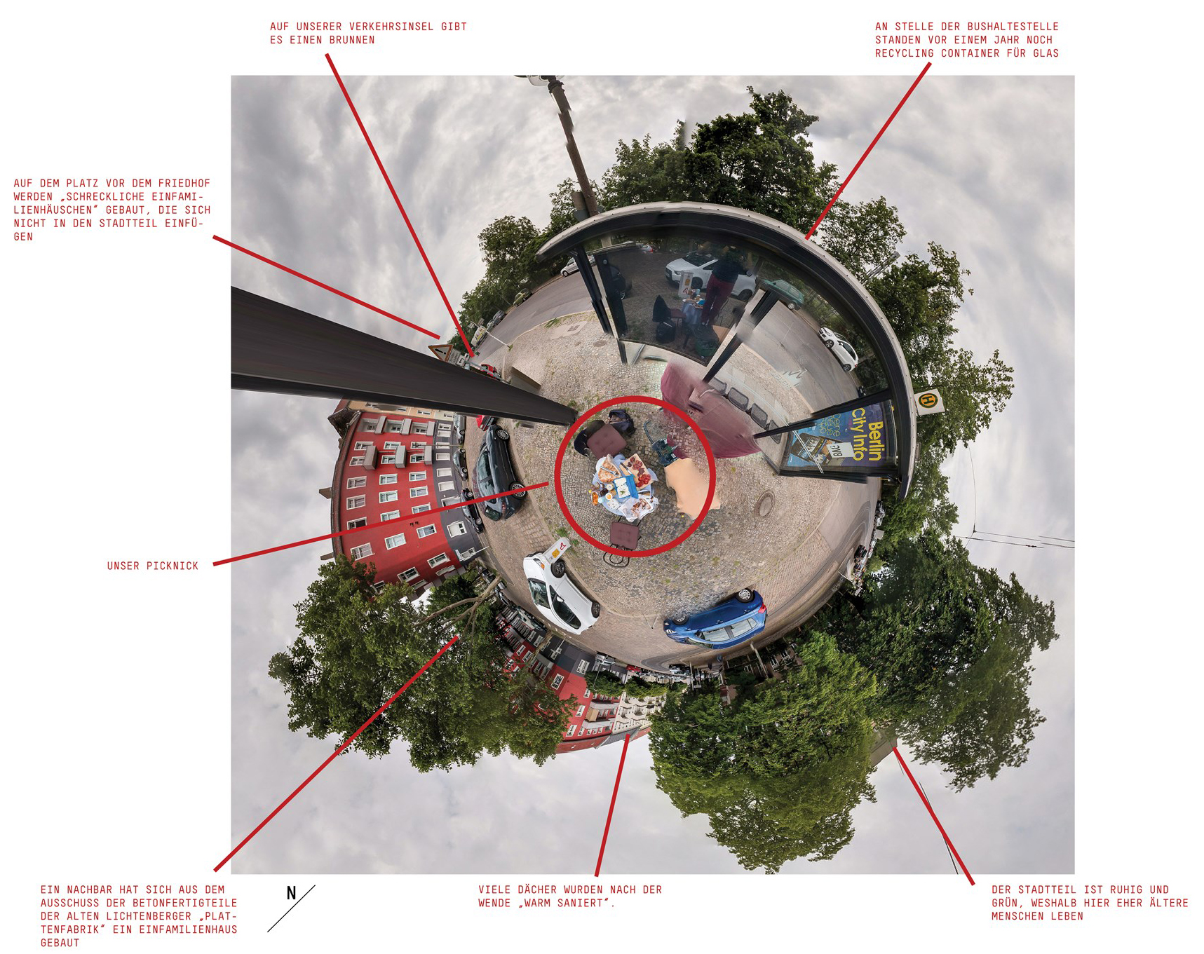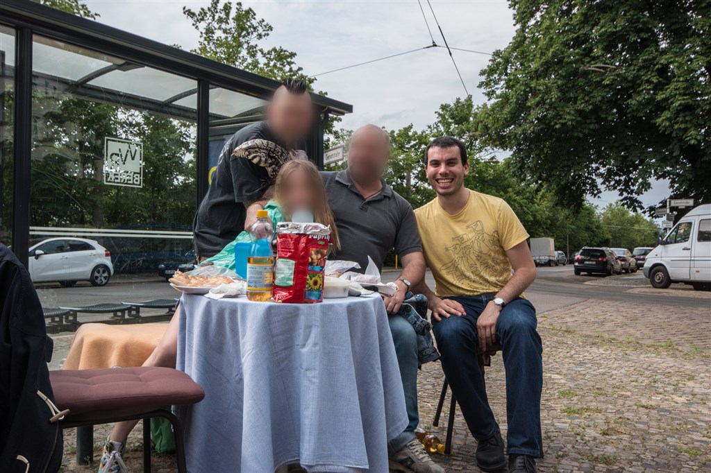 Ralf erzählte uns, dass Lichtenberg der flächenmäßig größte Bezirk Berlins sei. Der Stadtteil erstrecke sich sogar über das Gebiet jenseits des Bahndammes. Ralf wohne hier schon sein ganzes Leben lang und kenne sich im Bezirk gut aus. Als sein Bekannter Detlef mit einer Einkaufstüte an uns vorbeilief, grüßte er ihn. Detlef wollte sich weder zu uns setzen noch fotografieren lassen. Obwohl er zu seiner Frau zum Mittagessen musste, ging er schnell nochmal einkaufen. Einen Moment später tauchte Udo, ein tätowierter Feuerwehrmann, neben uns auf und zeigte uns seinen Leguan. Beide ließen sich für ein Familienfoto mit uns fotografieren. Udo musste mit seinem Leguan zum Tierarzt, weshalb er nicht lange bei uns bleiben konnte. Ralf scheint im Stadtteil weithin bekannt zu sein, zumindest unter denen, die an unserem Picknickplatz vorbeikamen. Als Udo gegangen war, gesellte sich Peter, ein Fahrradfahrer, zu uns. Peter wollte ebenfalls nicht fotografiert werden. Er blieb als Einziger bis zum Ende des Picknicks und erzählte uns viel von seinem Sohn und seiner Exfrau. Er scheint realtiv froh zu sein, aufgrund seines geringen Einkommens seiner Exfrau keinen Unterhalt zahlen zu müssen und findet es absurd, eine Geldstrafe bekommen zu haben, weil er mit seinem Sohn an der Spree Enten füttern war.