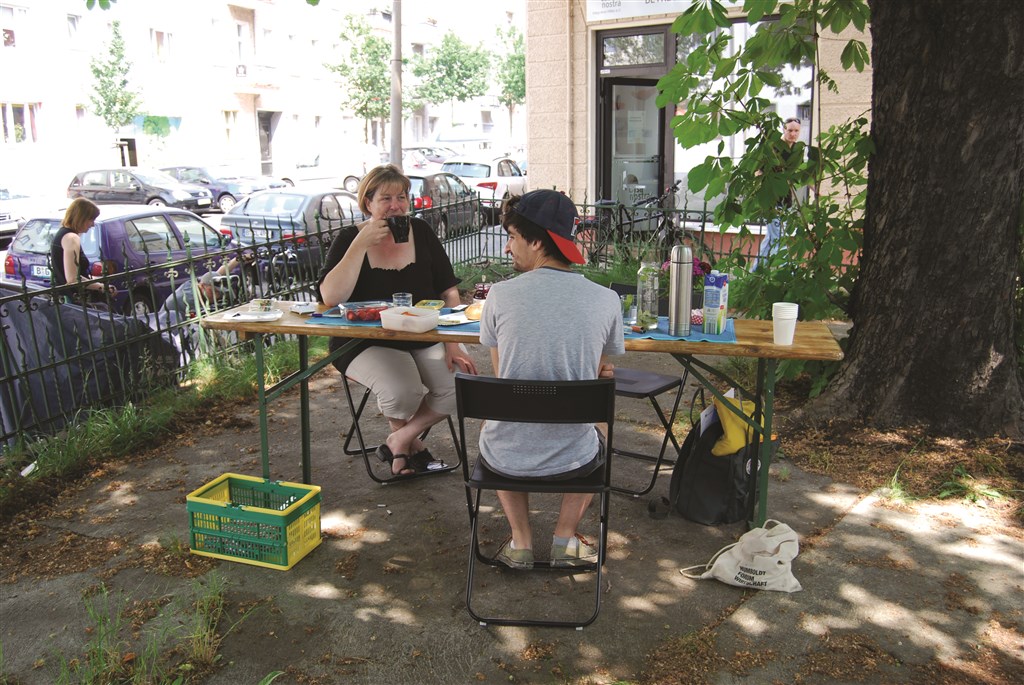 Manuela Zeumer leitet das Team Ost des eingetragenen Vereins Casa Nostra für integrative Hilfe in Lichtenberg. Mit ihrem Team betreut sie 60 Klienten, die sich in Wohnungsnot befinden. Jedoch geht es nicht nur um die Vermittlung eines Wohn-und Schlafplatzes, sondern auch um das Erkennen der Ursachen für die Not-situation und das Herausarbeiten der persönlichen Fähigkeiten ihrer „Jungs und Mädels”. Sie selbst sieht sich nicht als lokale Institution, doch wir konnten bei unserem Picknick sehen, wie stark der Bezug der Klienten zu Frau Zeumer ist. Mit dem Büro an der Hagenstraße 1 nimmt Casa Nostra e.V. eine Schlüsselposition im Kiez ein. Bei unserem Picknick mit Manuela Zeumer setzten wir uns mit einer Biertischgarnitur auf den kleinen Platz direkt vor das Büro von Casa Nostra. Unter zwei großen Bäumen und umringt von einem kleinen Zäunchen kamen wir ins Gespräch. Ab und zu liefen Passanten oder auch Klienten vorbei, die sie grüßten oder um einen kurzen Rat baten, wodurch wir einen Einblick in Frau Zeumers Arbeitsalltag gewinnen konnten.