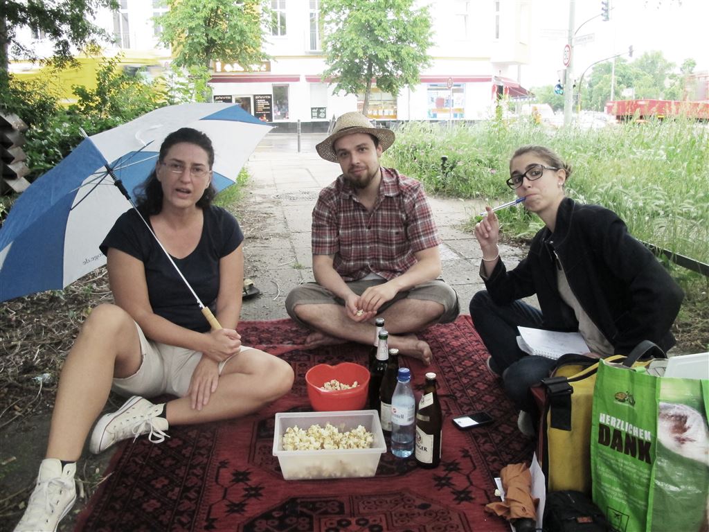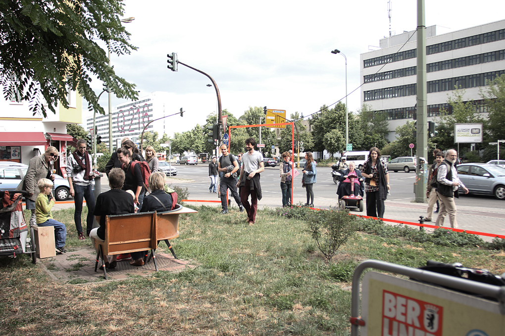 Normalerweise verspricht ein Picknickort zumindest ein gewisses Maß an Idylle. Wer denkt da nicht an eine grüne Wiese, ohne Lärm oder Motorengeräusch? Nicht so hier: Wir wollten uns dieses Reststück aneignen. Eine unscheinbare Fläche markieren, die von den meisten Passanten allenfalls als Abkürzung genutzt, aber nicht als Ort wahrgenommen wird. Das offensichtlich Unsichtbare sichtbar zu machen, ist ein Versuch, einen Durchgangsort als Aufenthaltsraum aufzuzeigen. Wir bieten eine Sitzgelegenheit und eine Tauschbibliothek als Anfang.