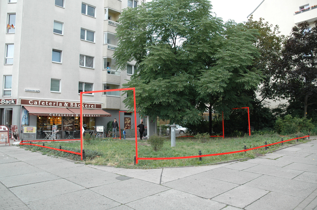 An der Ecke Alfredstraße und Frankfurter Allee liegt ein kleines, undefiniertes viereckiges Grundstück, das mit einem niedrigen, verschnörkelten Eisenzaun begrenzt ist. Warum haben wir diesen unscheinbaren Ort für unser Picknick gewählt? Er ist durch keine klare Identität, Relation oder eine Geschichte gekennzeichnet. Er ist ein „Nichtort“. Nach schweren Zerstörungen im zweiten Weltkrieg wurden in der DDR Plattenbauten entlang der Frankfurter Allee errichtet. Diese Ecke ist wahrscheinlich unbebaut geblieben, weil das Grundstück im vorgefertigte Raster übrig blieb. Wir wollen diesem Ort auf die Spur kommen.